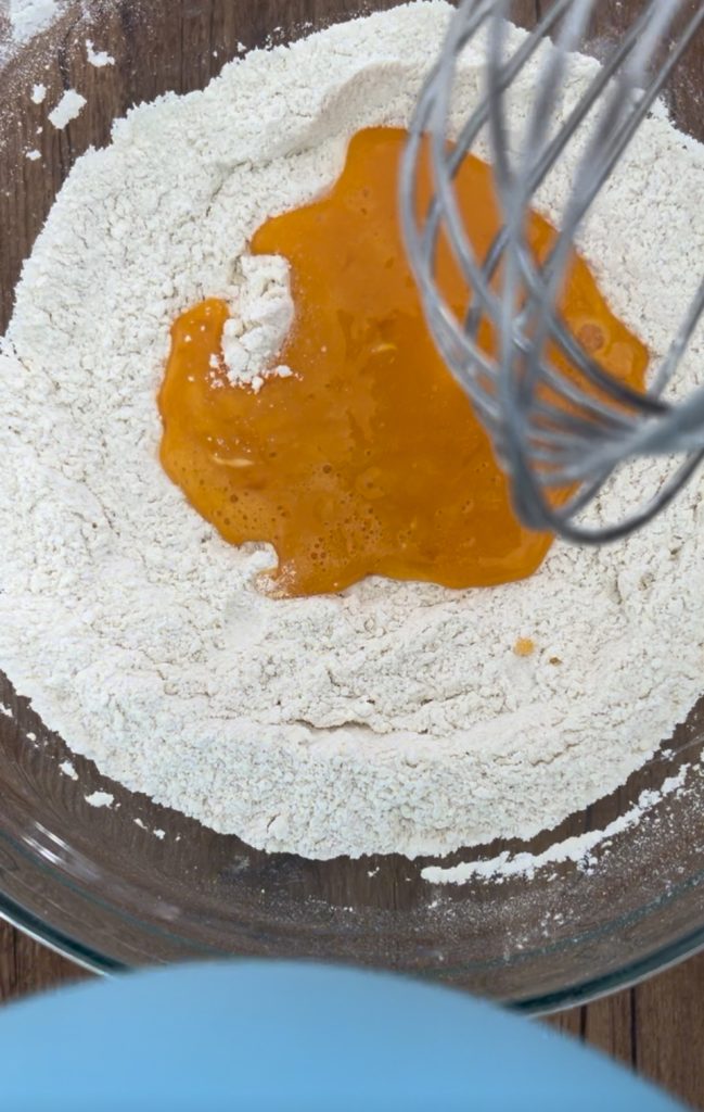 Voeg in een kom de gezeefde bloem en suiker samen.