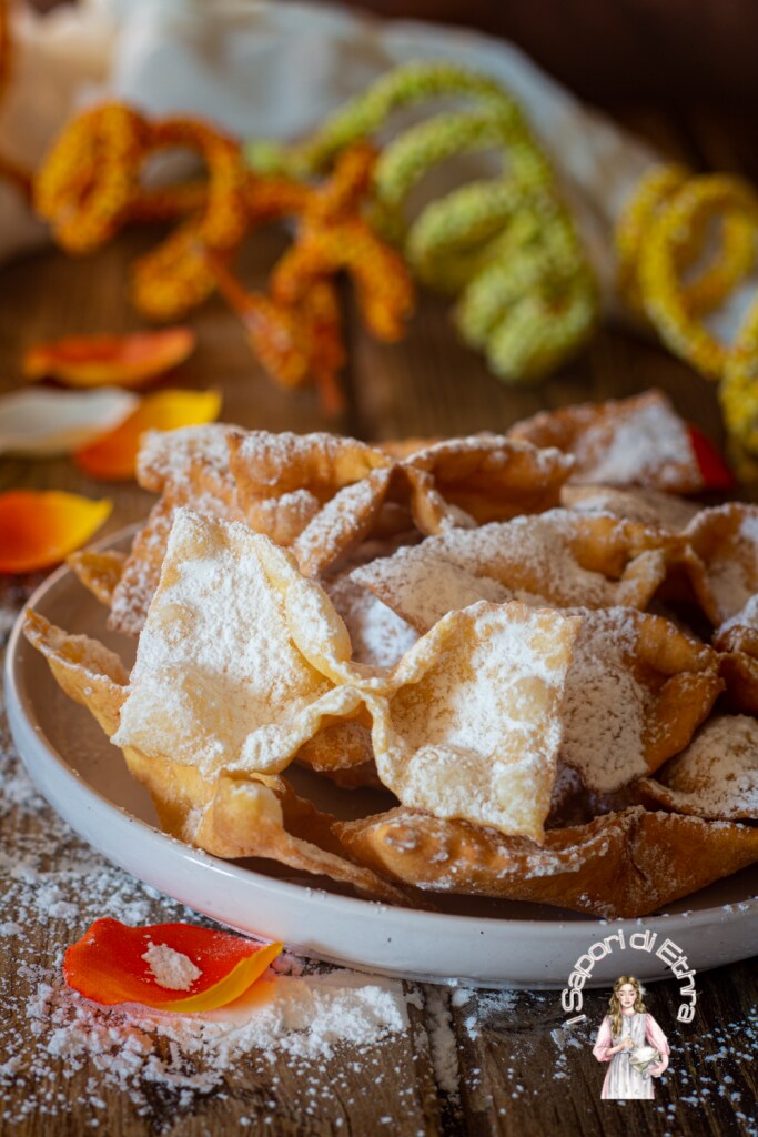 Vandaag een speciaal recept zoals alle recepten van meester Massari, de Chiacchiere Igino Massari krokant en bros. Natuurlijk heb ik ze in de vorm van een strikje of vlinder gemaakt, maar je kunt ook gerust de klassieke rechthoekige chiacchiere maken met inkepingen in het midden zoals deze Chiacchiere bollose all’arancia en Gran Marnier. Degenen die mij volgen weten heel goed dat ik dol ben op de recepten van meester Massari, dus wanneer ik een perfect recept wil, is het absoluut dat van hem dat ik ga bekijken en ik ben altijd weer verrukt. Veel aandachtspunten voor deze chiacchiere die op zijn zachtst gezegd perfect zijn. Laten we beginnen met het eerste en essentiële aandachtspunt dat Massari aanbeveelt, namelijk dat het deeg zo dun mogelijk moet zijn, zodat het bijna transparant is en je bijna kunt zien wat er aan de andere kant van het deeg is. Een andere tip wanneer we het deeg bereiden, is om het niet te laten rusten, maar het meteen te frituren, laat het dan uitlekken op een rooster en strooi er vervolgens poedersuiker over. Een andere essentiële factor is de temperatuur van de olie, die strikt 175° moet zijn. Bovendien raadt de meester ook aan om de chiacchiere 1 minuut in de oven te doen en dan ervan te genieten. Je kunt de chiacchiere bewaren op een koele en droge plaats, in een goed afgesloten bak, voor 2 of 3 dagen.