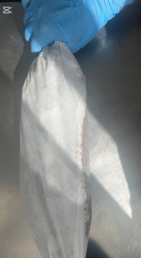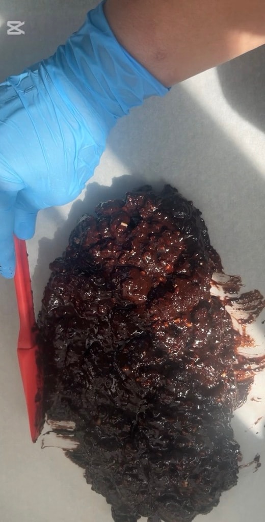 Giet het mengsel voorzichtig op een groot vel bakpapier. Vorm met een spatel een cilinder.