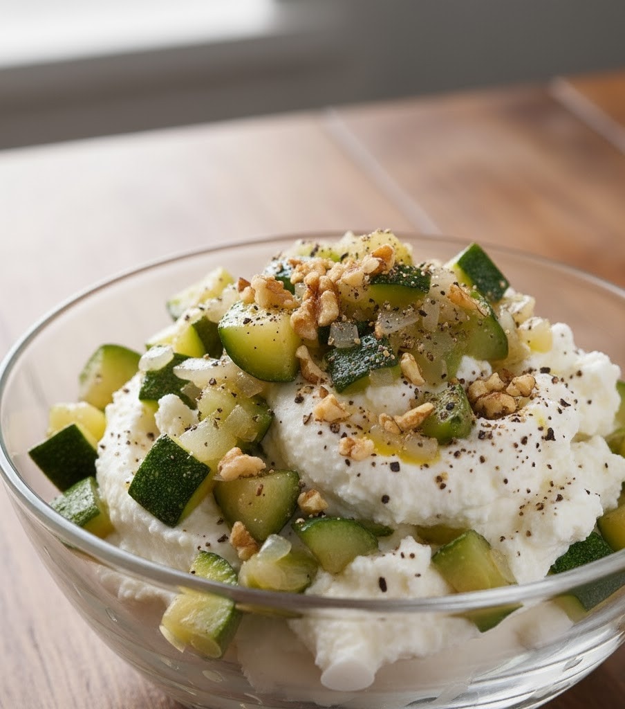 Doe de eerder verkruimelde ricotta in een kom, voeg de courgettes toe en meng de ingrediënten goed, peper vervolgens lichtjes.
