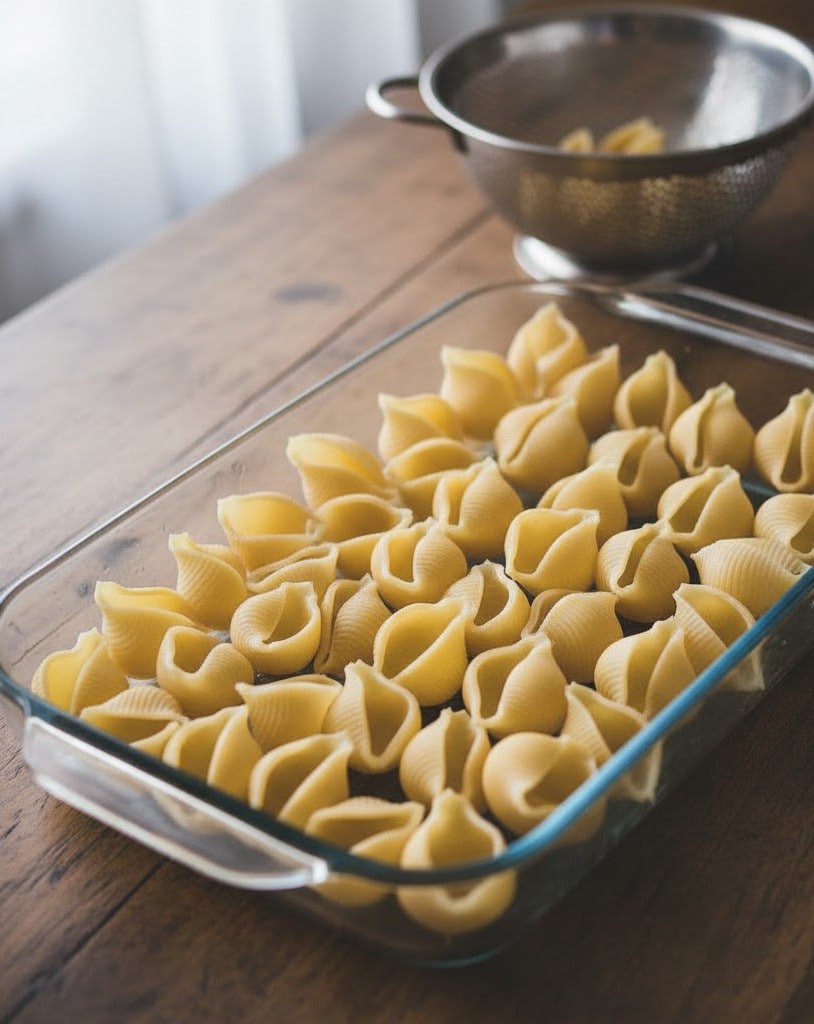 Giet de al dente gekookte conchiglioni af, plaats ze in een ovenschaal