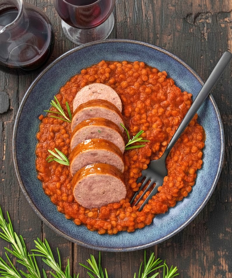 Cotechino en linzen is het symboolgerecht van Oud en Nieuw in Italië. Hoewel de versie “in umido” (met tomatensaus) niet de meest gebruikelijke is in alle regio’s, is het een zeer geliefde variant omdat het gerecht romiger, smaakvoller en perfect voor de “scarpetta” maakt.