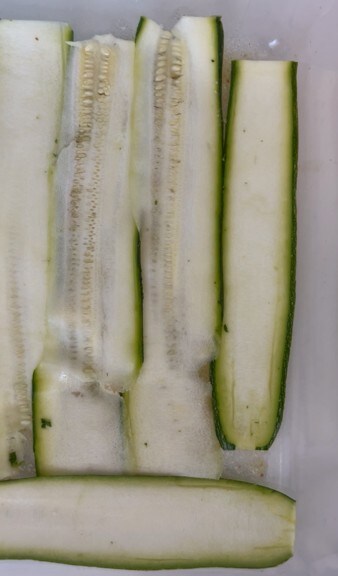 Leg de dun gesneden courgetteplakken zonder ze te overlappen met een mandoline