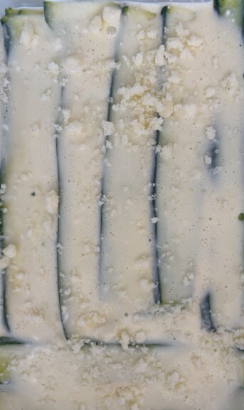Herhaal het proces met room en courgettes tot alles op is en eindig met een laagje Grana bovenop.