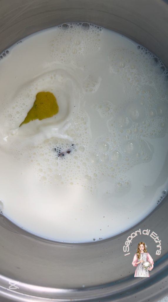 Week de gelatine in koud water. Verwarm de melk met de vanillezaadjes en de citroenschil, zorg ervoor dat je alleen het gele deel van de citroen neemt en niet het witte, anders zou het te bitter zijn.