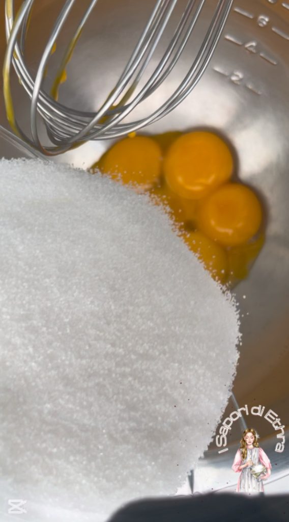 Ondertussen in een kom de eidooiers en de suiker mengen. Snel roeren.