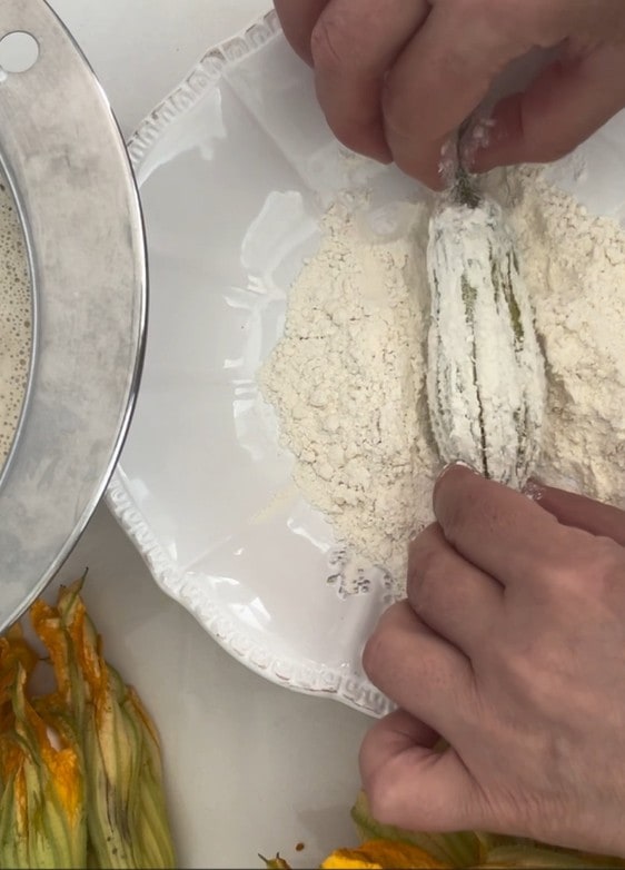 Gevulde courgettebloemen in knapperig beslag! Een ware triomf van de Italiaanse keuken, een hap die de delicatesse van de bloem en de heerlijkheid van de vulling omhult, allemaal verpakt in een korst die zingt onder de tanden.
