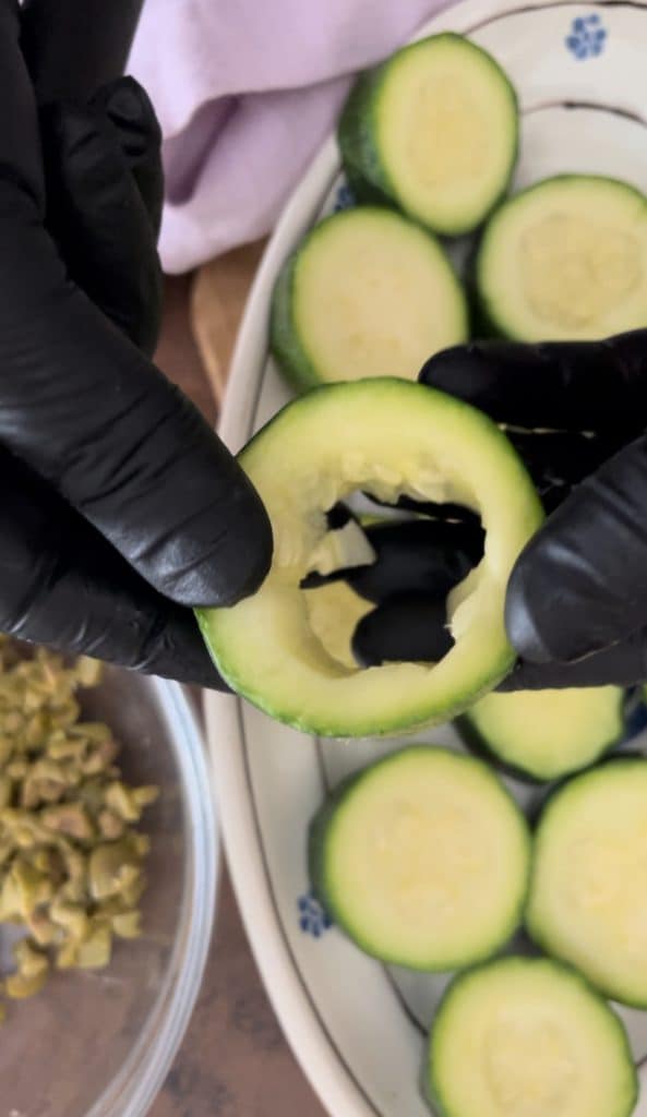 • Hak de groene olijven fijn en voeg ze toe aan de kom met het courgettevruchtvlees.