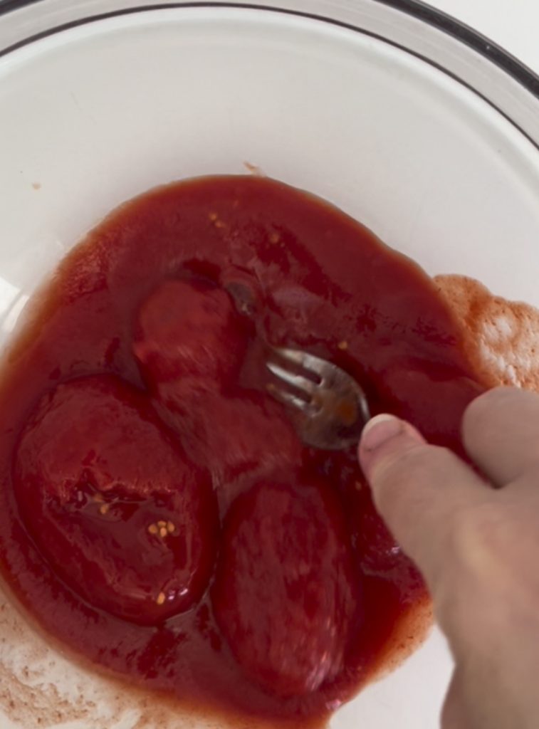 Ondertussen de saus bereiden. De gepelde tomaat met een vork fijnmaken