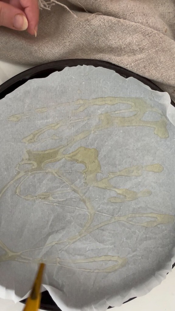 Bekleed de bakvorm met bakpapier en giet er een beetje extra vergine olijfolie overheen