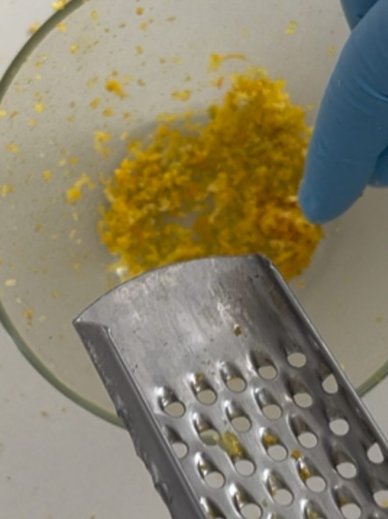We gaan nu verder met de vulling. Rasp de schillen van citroen en sinaasappel en zet apart.