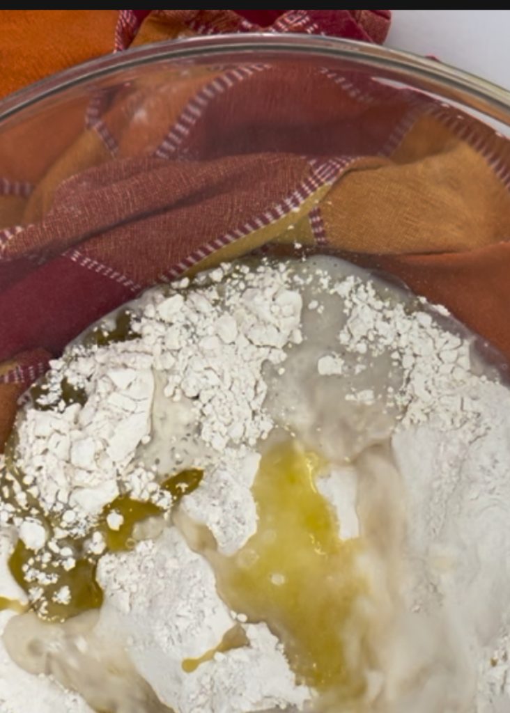 • Bereid eerst het deeg voor de pizza. Los de gist op in lauwwarm water in een kom