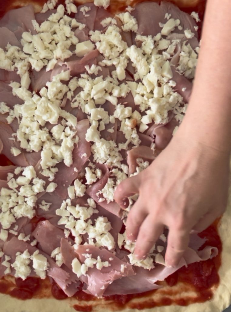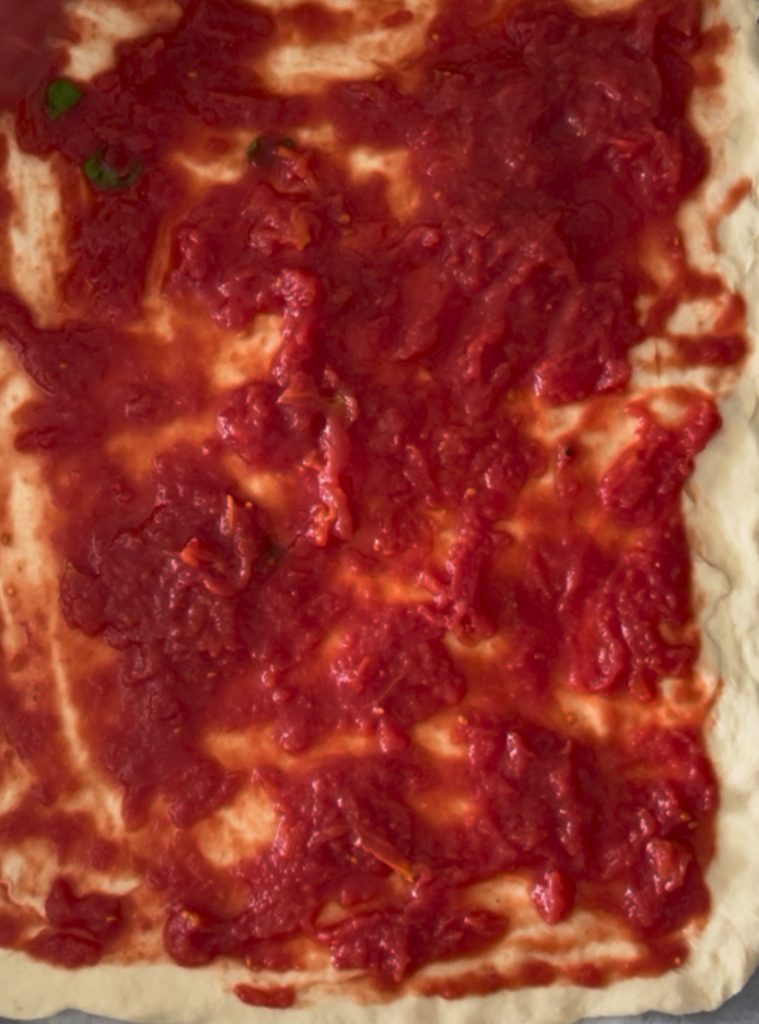• Druk de gepelde tomaat met je handen plat, breng op smaak met zout, extra vergine olijfolie en verdeel deze over het deeg, iets van de rand wegblijvend.