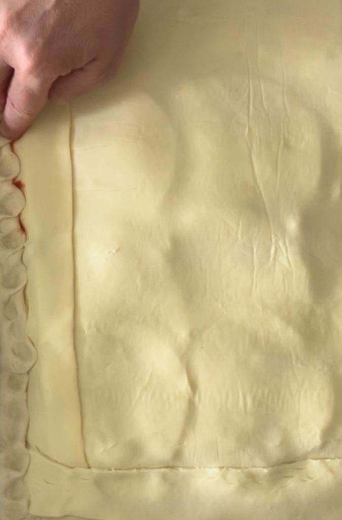 • Bedek met het rechthoekige vel bladerdeeg. Sluit de randen en prik het deeg met een vork