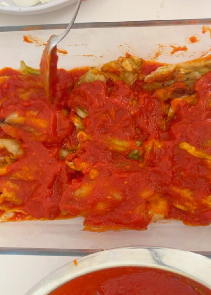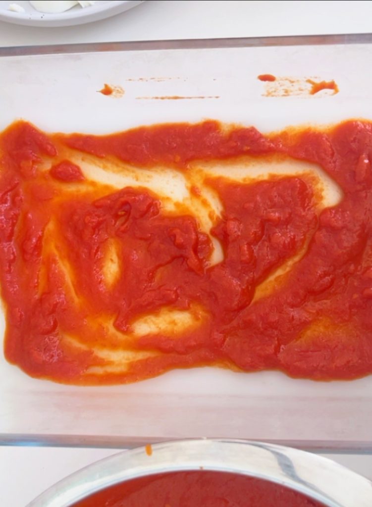 Als de saus enigszins is afgekoeld, begin dan onze parmigiana van courgettebloemen te assembleren. Begin met een pollepel om de saus in de ovenschaal te gieten