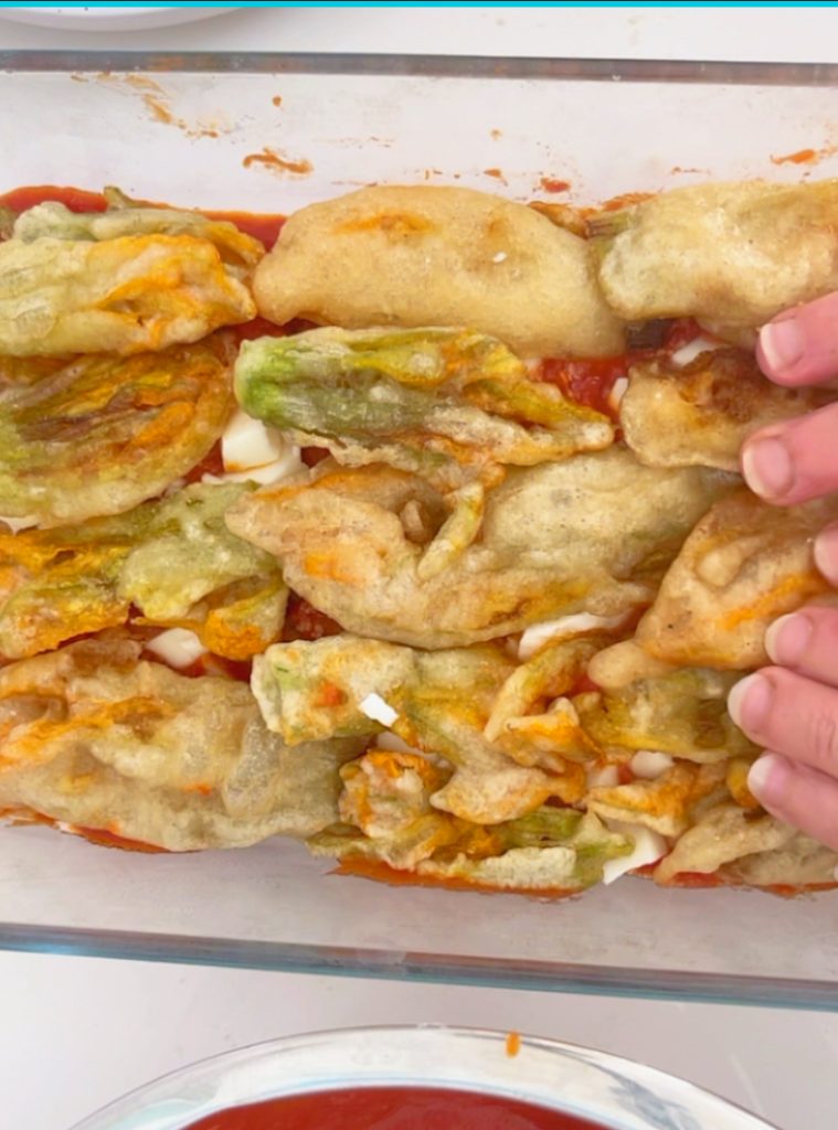 mozzarella en bakken in een voorverwarmde oven op 180 graden voor 35 minuten. Laat iets afkoelen voor het serveren van onze parmigiana van courgettebloemen.