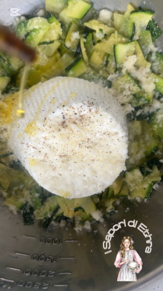 Doe de gekookte courgette in een beker of kom samen met de Parmezaanse kaas en de ricotta