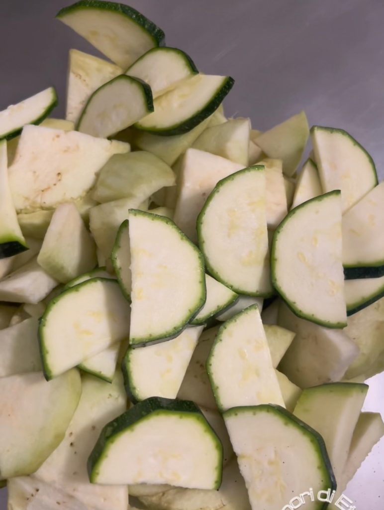 Snijd de aubergine in dunne plakjes en doe ze in een kom