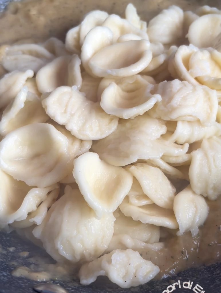 en voltooi de gaarheid van de orecchiette in de pan met de groentecrème.