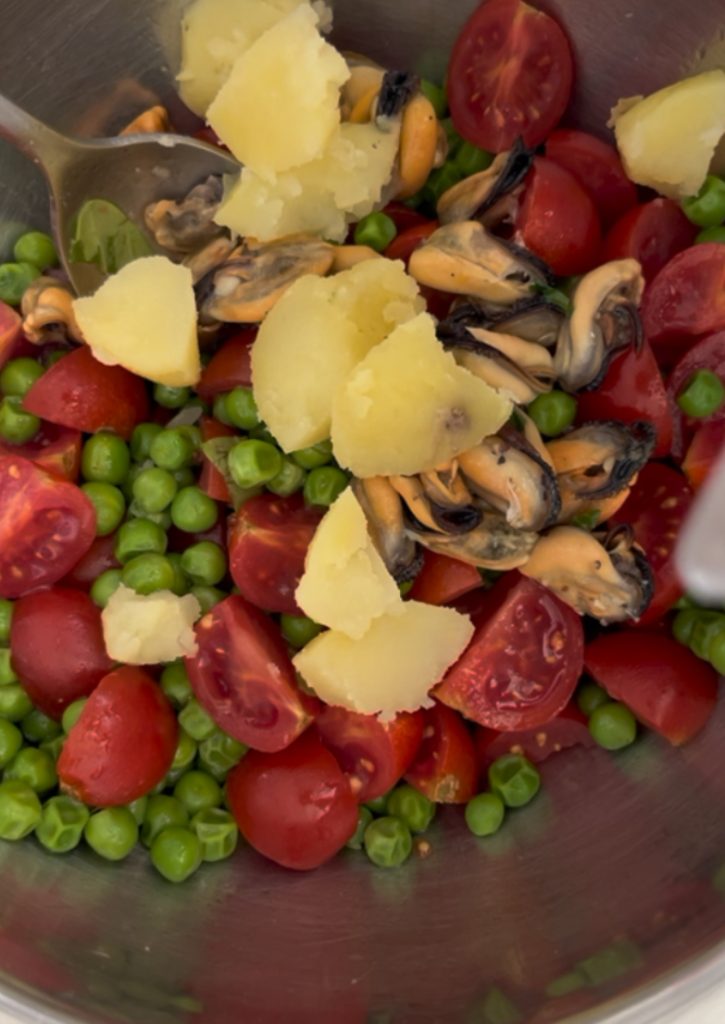 en nog een scheutje olie. Laat in de koelkast rusten en geniet van deze geweldige pastasalade met mosselen en aardappelen.