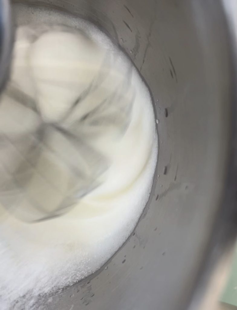 Probeer de suiker geleidelijk toe te voegen, dit duurt ongeveer 10 minuten tot je deze consistentie bereikt.