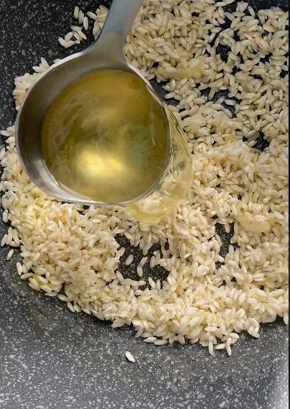 Voeg het warme kookwater van de raapstelen toe (gebruikt om de raapstelen te koken en de raapstelencrème te bereiden) telkens wanneer de rijst het nodig heeft.