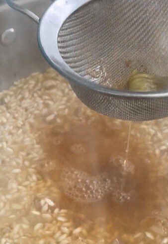 Blijf de risotto roeren en voeg de bouillon toe telkens als de rijst het nodig heeft.