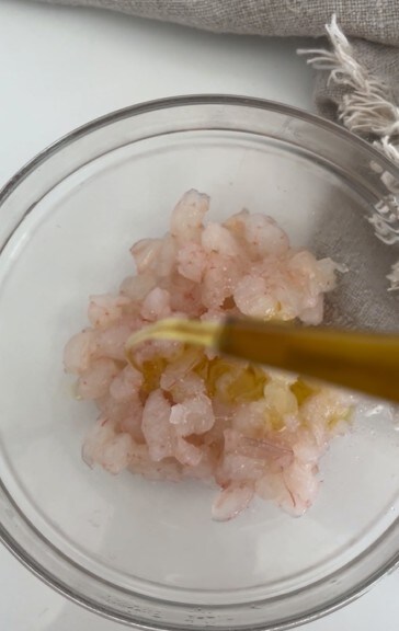 Snijd de garnalen in stukjes en breng op smaak met zout, extra vergine olijfolie en peper