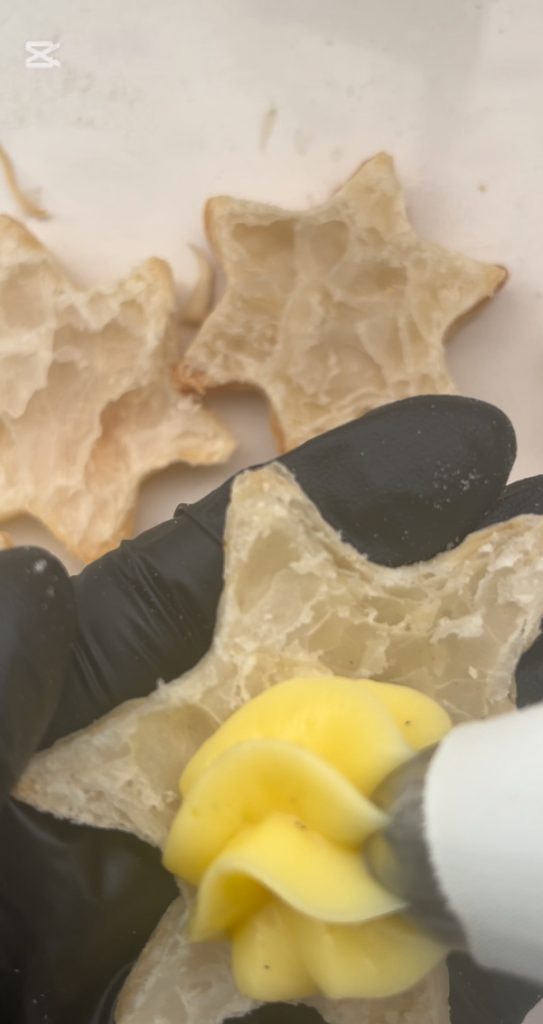 Plaats de sterren van groot naar klein op elkaar met een beetje banketbakkersroom tussen elke sporcamuss om de sterren niet te laten instorten.