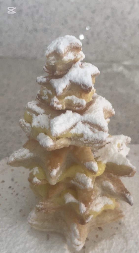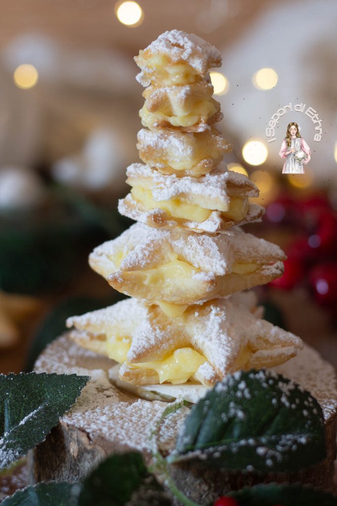Sporcamuss van Kerstmis. Goed, en ook dit jaar zijn we er vroeg bij om je wat eenvoudige en smakelijke ideeën te geven om te maken tijdens de kerstfeestjes. Probeer deze Kerstboom van sporcamuss, een typisch Apulisch en specifiek Barisch dessert. Waarom heet dit Apulische dessert sporcamuss? Omdat het onmogelijk is om het te eten zonder je gezicht te bevuilen. Ik verzeker je dat het in de vorm van een ster is gevuld en geplaatst als een boom heel leuk is. Wat denk je van dit idee? Ik maak van de gelegenheid gebruik om jullie fijne feestdagen te wensen en jullie allemaal te bedanken voor jullie steun.