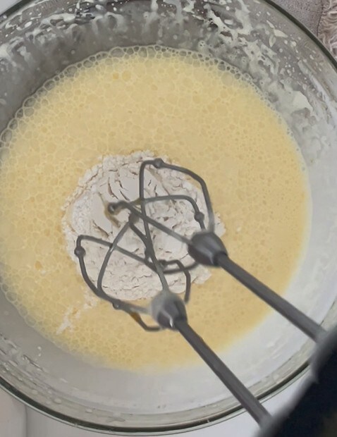 en tenslotte beetje bij beetje de gezeefde bloem en bakpoeder toevoegen