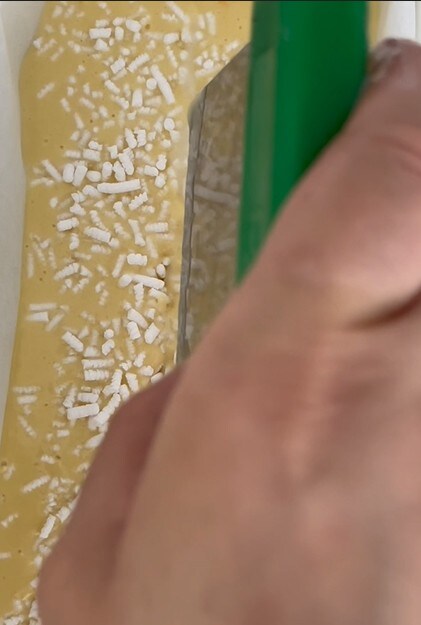 Bevochtig de spatel met boter en snijd de cake in het midden. Zo krijg je de klassieke scheur in het midden.
