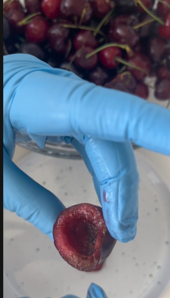 Het eerste wat je moet doen is de pit uit de kersen verwijderen.