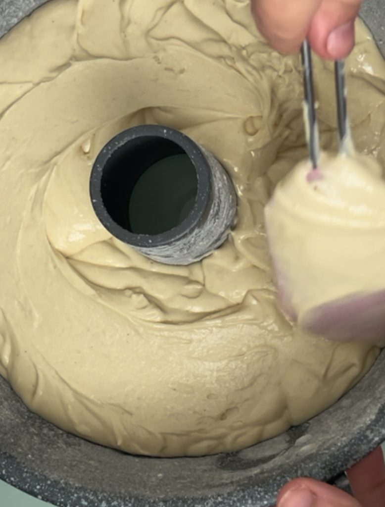 en giet het in een ingevette en met bloem bestoven cakevorm