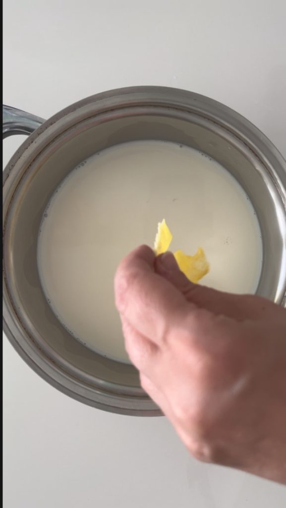 De geraspte citroenschil zonder het witte deel en breng aan de kook