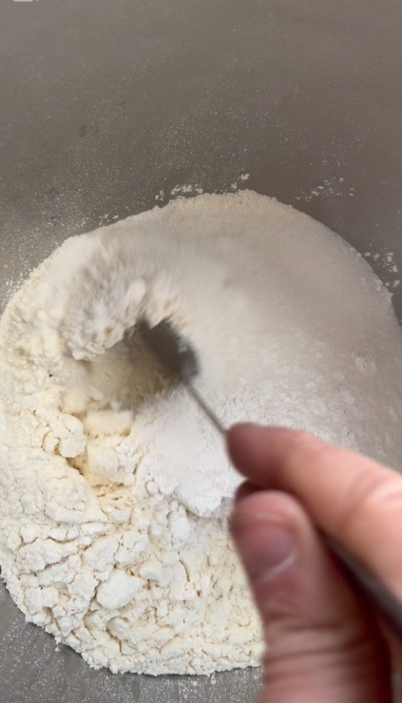 • In een planeetmenger of als je wilt, kun je het ook met de hand doen op een werkblad, de bloem, suiker, wijnsteen, zuiveringszout gieten en met een lepel roeren om de ingrediënten te mengen.