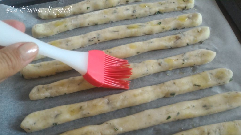Leg de grissini beetje bij beetje op een met bakpapier beklede bakplaat.