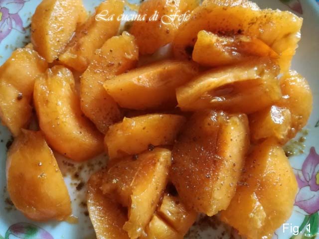 Begin met het wassen van de abrikozen, schil ze vervolgens en verwijder de pit. Snijd de eerste twee in plakjes en bestrooi ze met de ruwe rietsuiker (fig. 1).