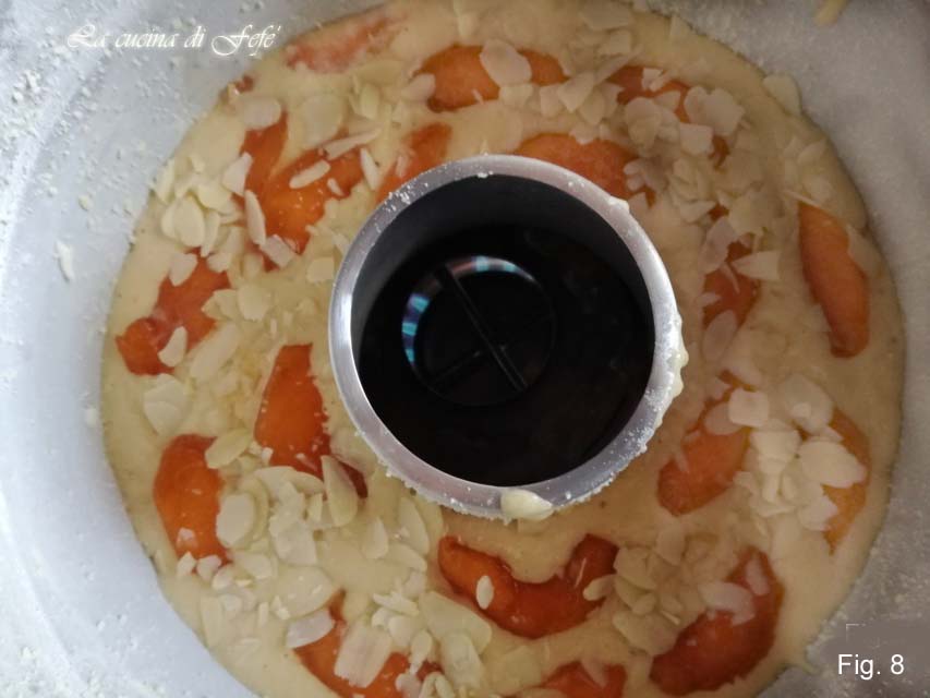 Meng met een spatel en giet het mengsel direct in de oven. Garneer de bovenkant met de overgebleven amandelen en de in plakjes gesneden abrikozen (fig. 8).