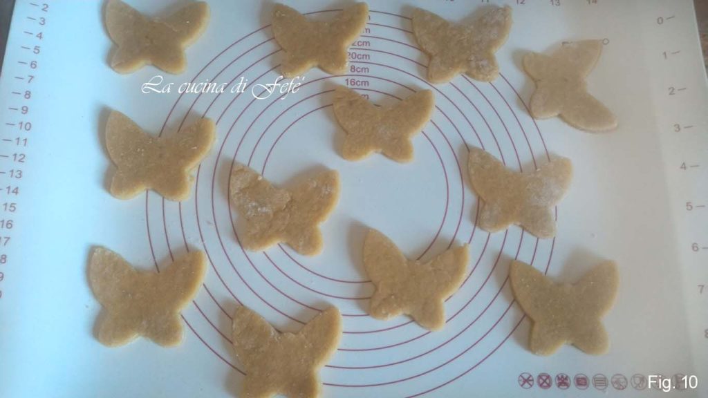 • Leg de koekjes op een bakplaat met herbruikbare siliconenmat of bekleed met bakpapier, zorg ervoor dat je ze iets van elkaar plaatst om te voorkomen dat ze samenkleven wanneer ze in de oven rijzen (fig. 10).