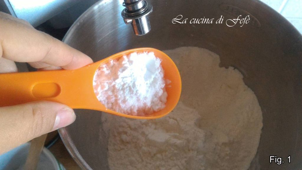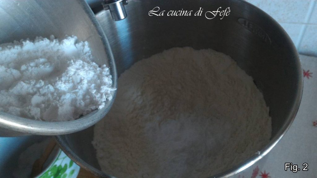 • Giet het gezeefde bloem en aardappelzetmeel in de kom van de keukenmachine (fig. 1).