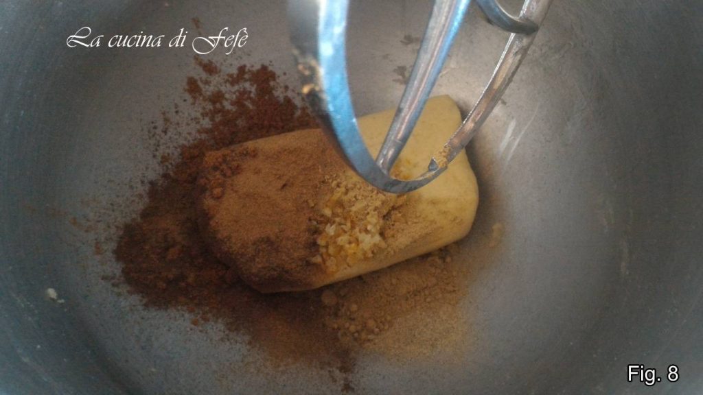 • Voor de speculaas mannetjes en sneeuwvlokken (c.a 20): neem een van de 5 deegballen en plaats het in de keukenmachine, voeg de fijn gesneden gekonfijte sinaasappelschil, cacao en specerijen in poeder toe (fig. 8).