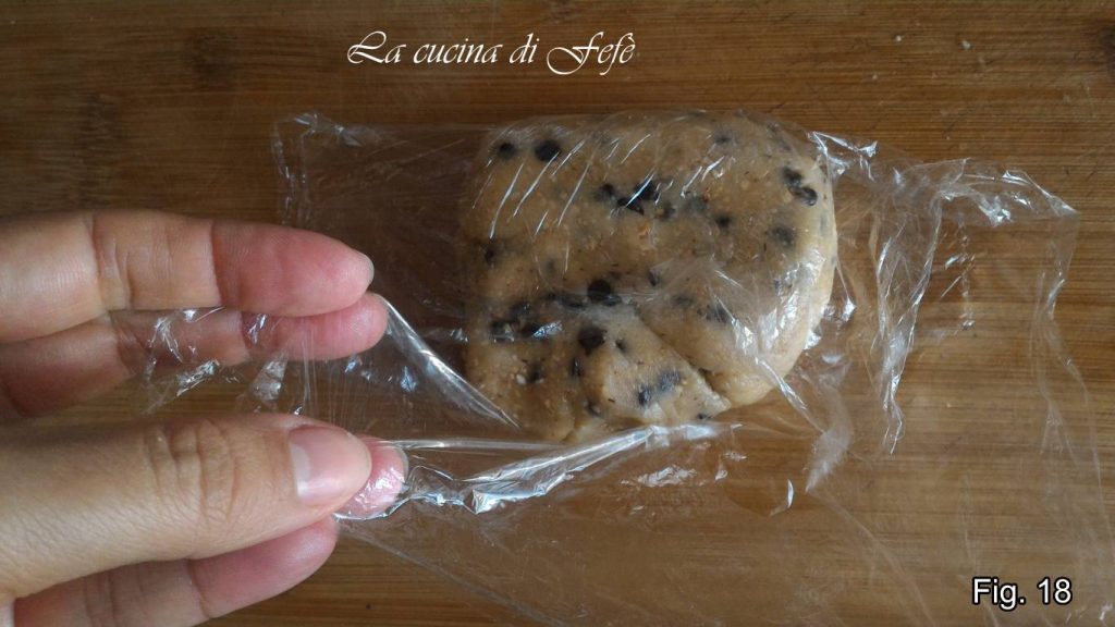 • Je moet een goed homogeen mengsel krijgen. Druk het plat, wikkel het in zijn huishoudfolie en plaats het in de koelkast 20′ (fig. 18).
