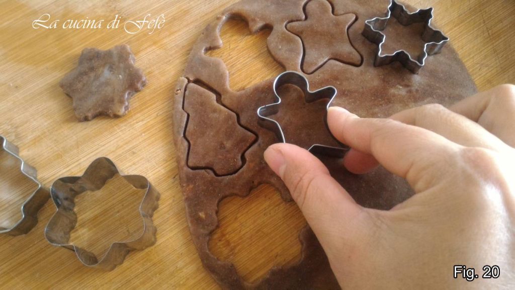 • Gebruik uitsteekvormpjes in de vorm van een gingerbread man en sneeuwvlokken om je koekjes uit te snijden tot het deeg op is (fig. 20).