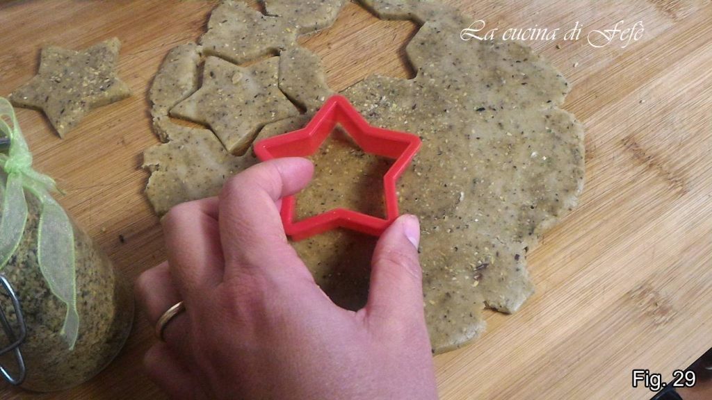 • Rol ook het pistachedeeg uit tot een dikte van 3-4 mm, snijd je koekjes uit met een groot stervormig uitsteekvormpje (fig. 29).