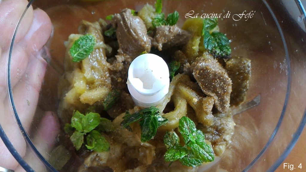 Doe de auberginepulp in een mixer, voeg de tahina, de munt, de olie, het citroensap, de knoflookpoeder, een snufje zout en een draai van de molen met peper toe.