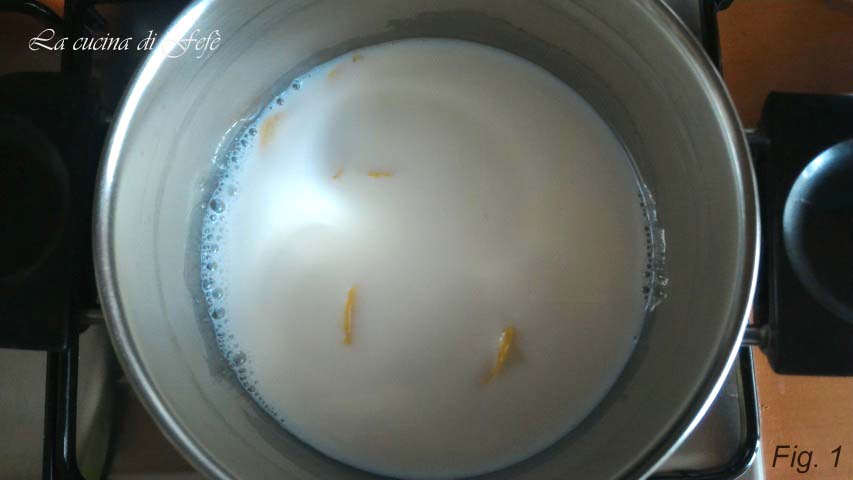 • Giet de voorgeschreven hoeveelheid melk in een pan met dikke bodem, voeg ook de onbehandelde citroenschil toe en breng alles aan de kook.