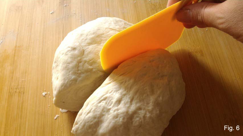 • Na deze tijd, verwijder de folie en verdeel het deeg in twee met behulp van een schraper (fig. 6).
