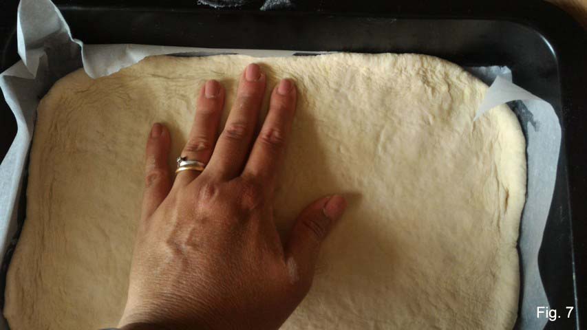 • Op dit punt kun je elk deeg direct in de bakplaten – die eerder zijn ingevet en bekleed met bakpapier – uitrollen door zachtjes met je vingertoppen te drukken om het deeg langzaam uit te breiden en het aan je bakplaat te laten hechten, of door het uit te rollen met een deegroller op een met bloem bestoven werkoppervlak om dunne schijven te maken of naar wens. De 2 uitgerolde bodems moeten tenslotte, voordat ze de oven in gaan, nog 30 minuten worden bedekt met een schone doek voor een tweede rijs (fig. 7).