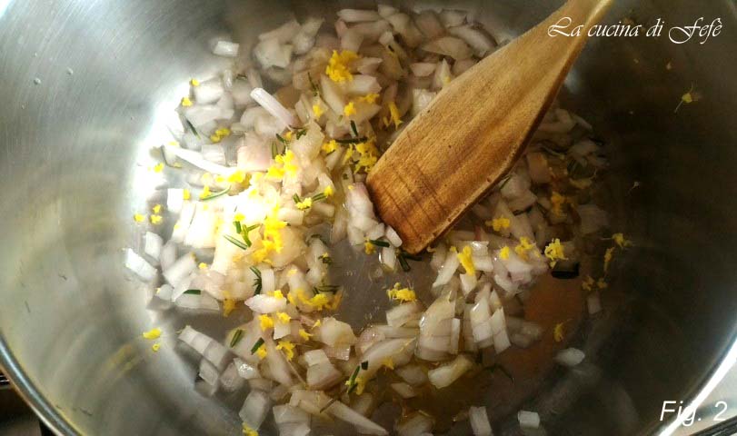 Hak de ui fijn. Laat deze goudbruin worden in een pan met een scheutje olie, de geraspte gember en de met de hand verkruimelde rozemarijn, roer vervolgens en laat een paar minuten smaken (fig. 2).